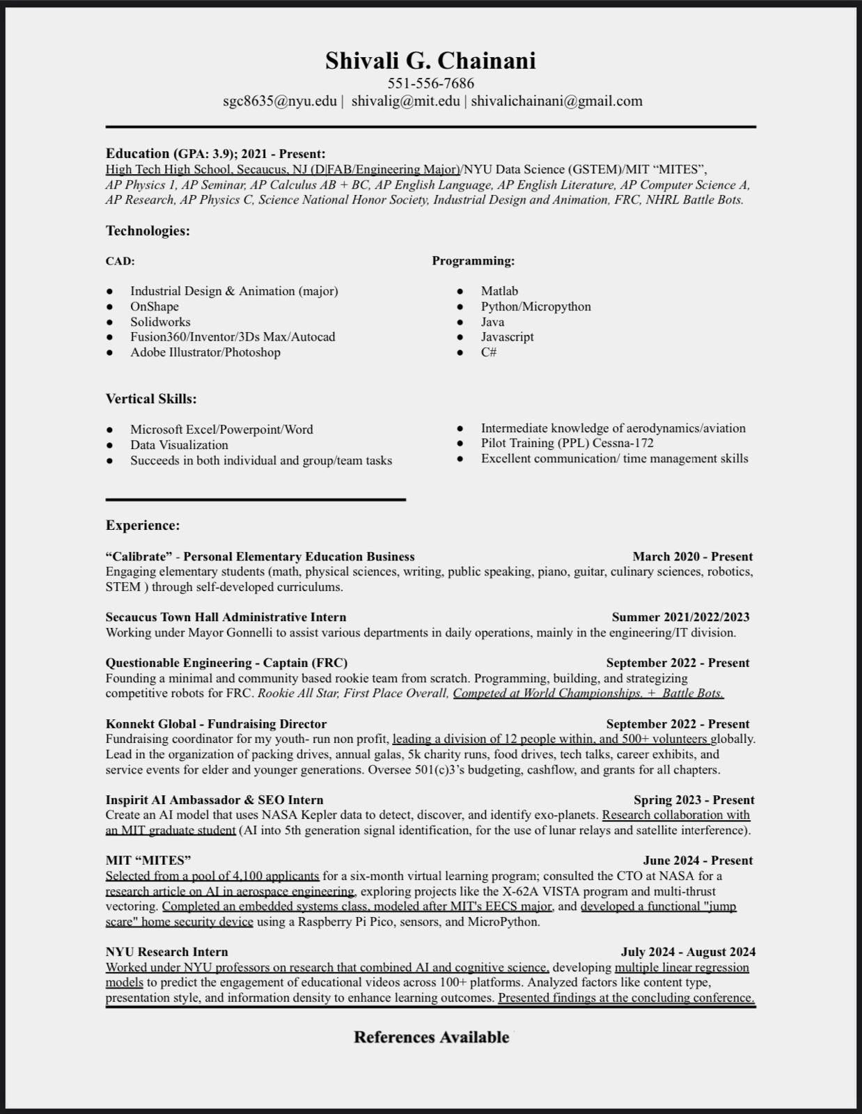 Additionally, after consulting with NASA’s CTO, I explored AI’s role in aerospace, and its potential impact. This experience deepened my passion for innovation in technology and space science.